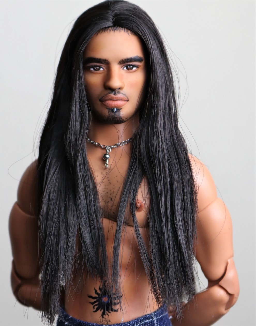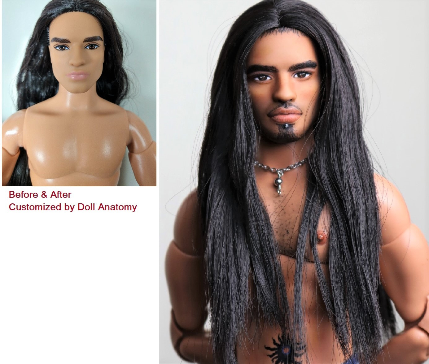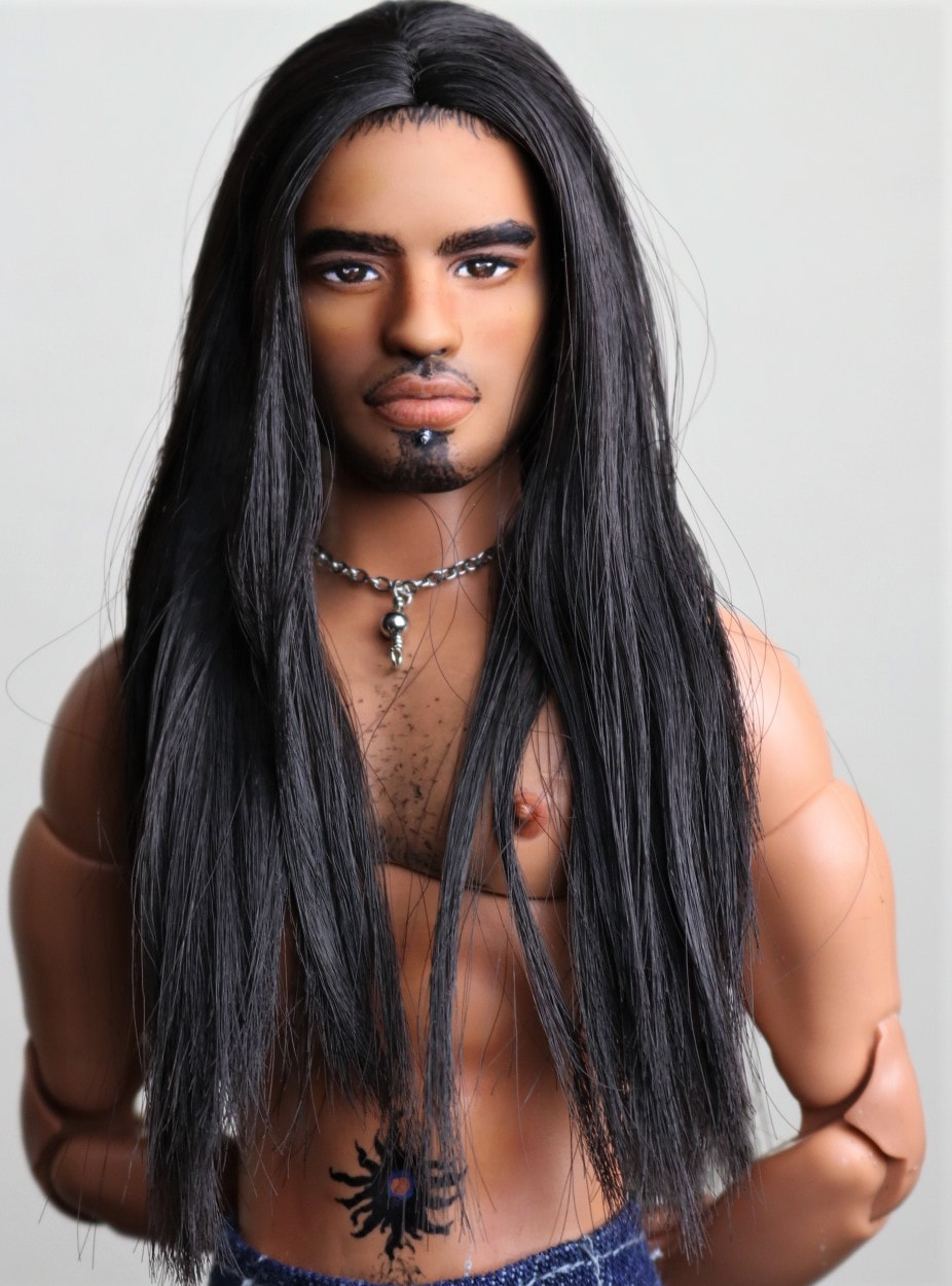 -Ka'eo is a full repaint with quality paints & sealers done by an experienced doll artist. He is deliberately like no other 1/6 scale or Ken doll on the market! Please note that Ka'eo has facial and body shading to depict realism. He has a beautiful face with enchanting dark brown eyes, a light tan skin tone, full pillow lips, a beard, a chin piercing, an earring, raven black hair, + a navel tattoo. Ka'eo looks like a real guy! He would make a very attractive & exciting character for your doll community!