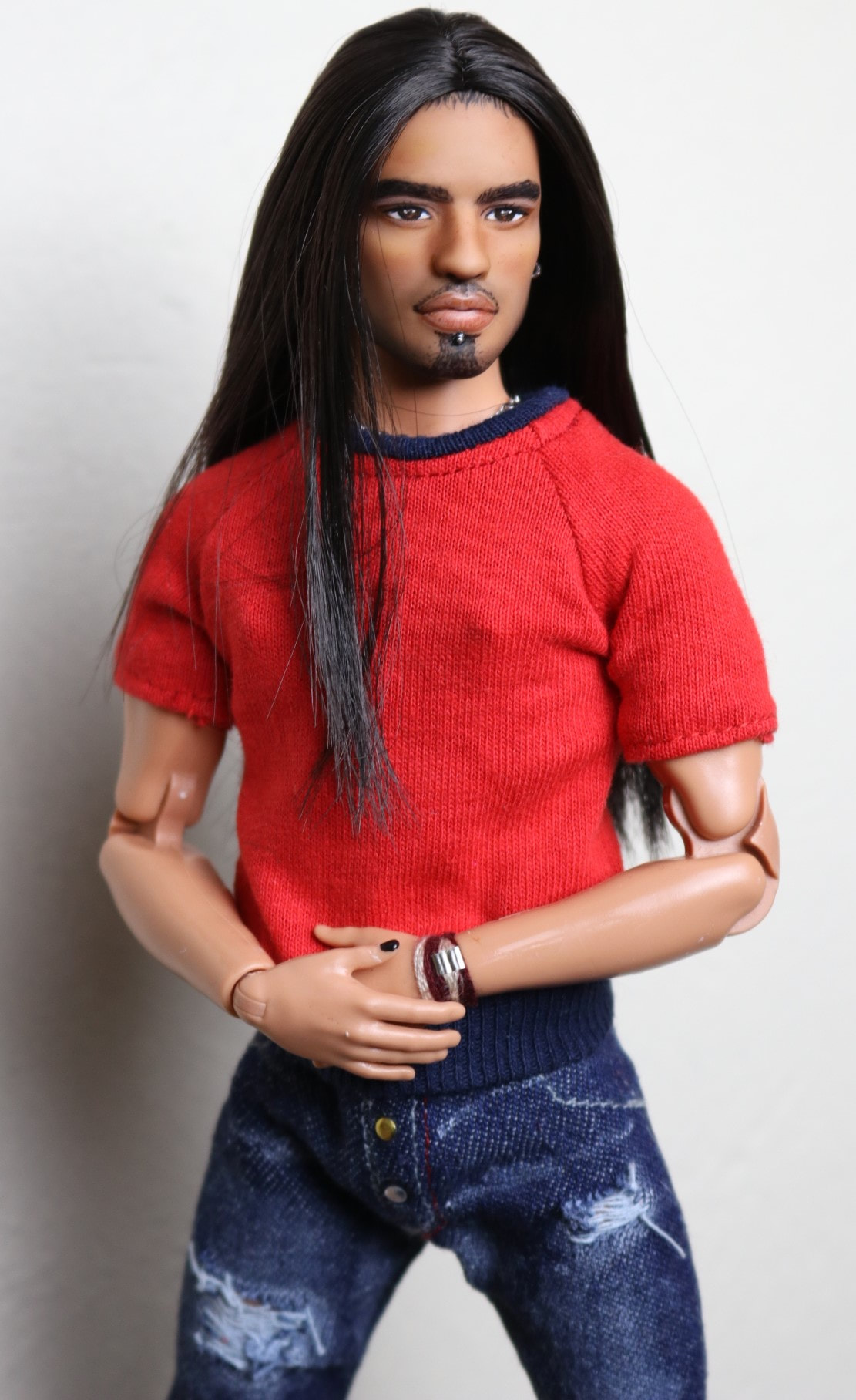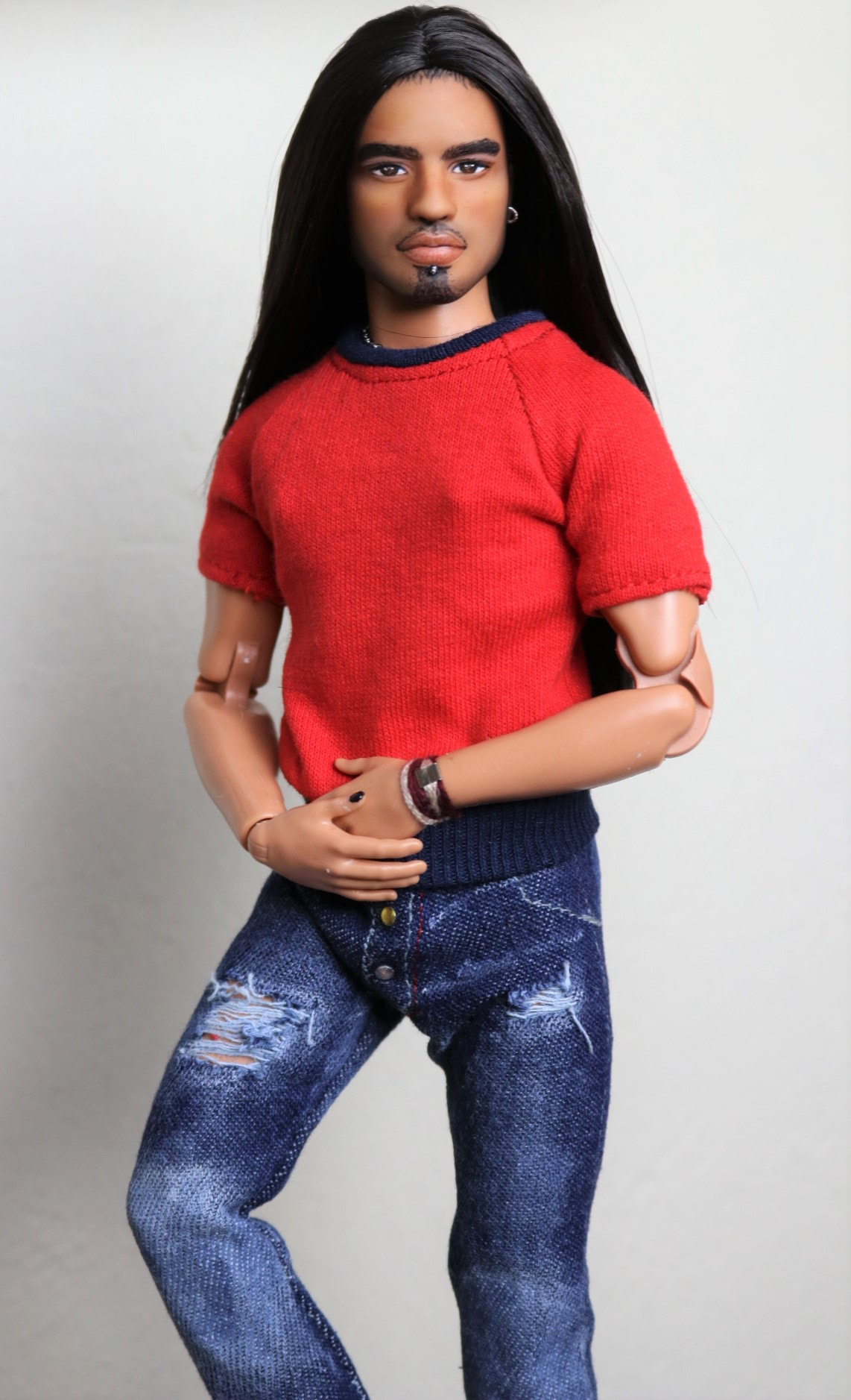 - For your doll play pleasure he comes dressed as shown with a complete handmade outfit that includes handmade destressed jeans, a handmade top, and handmade jewelry. His ear is pierced & so is his chin. He will come with shoes.